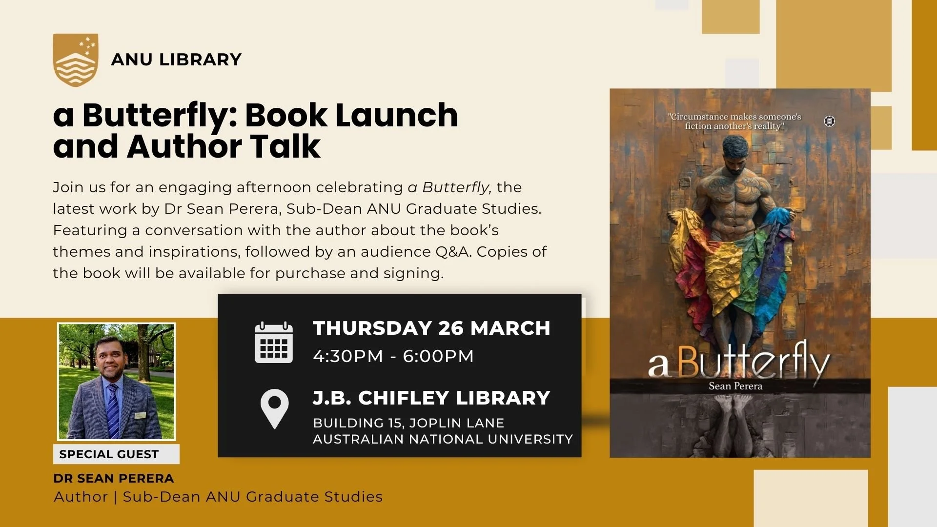 Join ANU’s J.B. Chifley Library for an engaging afternoon celebrating a Butterfly, the latest work by Dr Sean Perera, Sub-Dean ANU Graduate Studies. Featuring a conversation with the author about the book’s themes and inspirations, followed by an audience Q&A. Copies of the book will be available for purchase and signing.